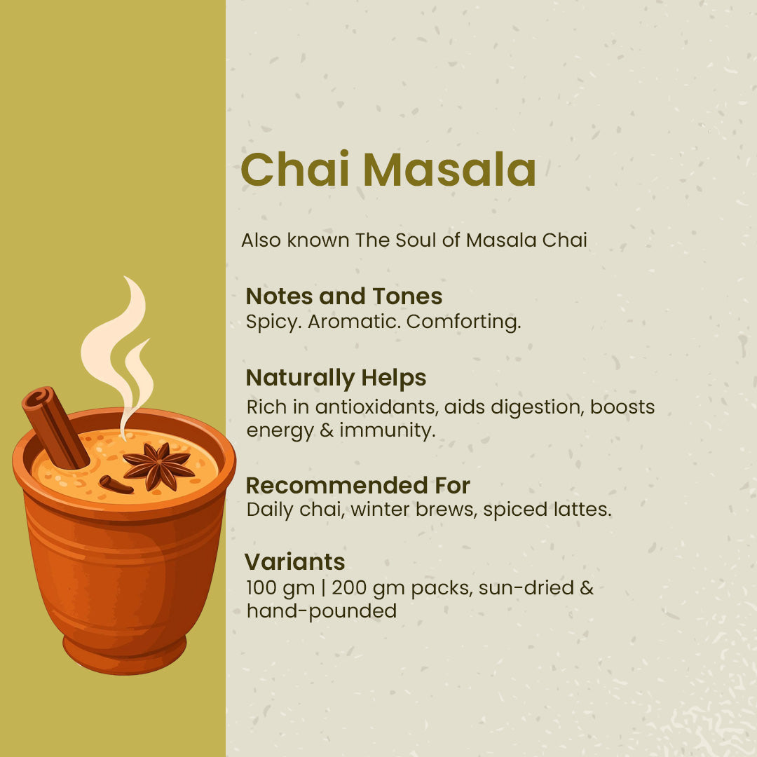 There is chai, and then there is masala chai. Our secret family recipe of Chai Masala is a soulful blend of spices from the backwoods farms of Kerala and the foggy hills of Meghalaya & West Bengal, traditionally hand-pounded in a simplistic Okhli to remain as full-bodied and natural as possible.