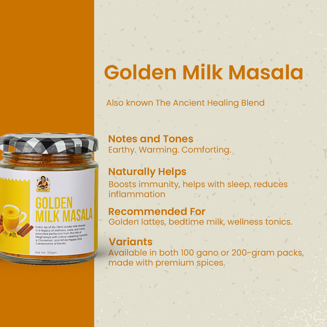 Every sip of My Okhli Golden Milk Masala is more than a beverage; it’s a golden legacy of wellness, taste, and hand-pounded perfection from the hills of Meghalaya, West Bengal and Kerala.