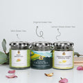Three Jars heritage box carrying each of The Original Green Tea (50gms) , Mint Green Tea (50 gms), and Lemongrass Green Tea (50gms),
